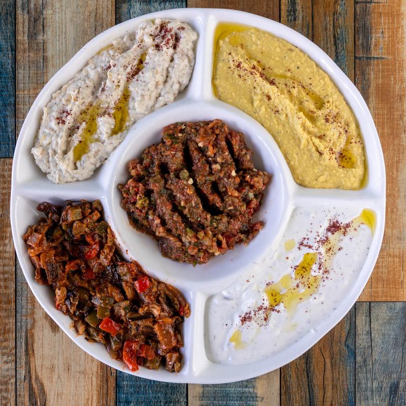 Smoked eggplant blended with yogurt, tahini, lemon juice, and garlic.