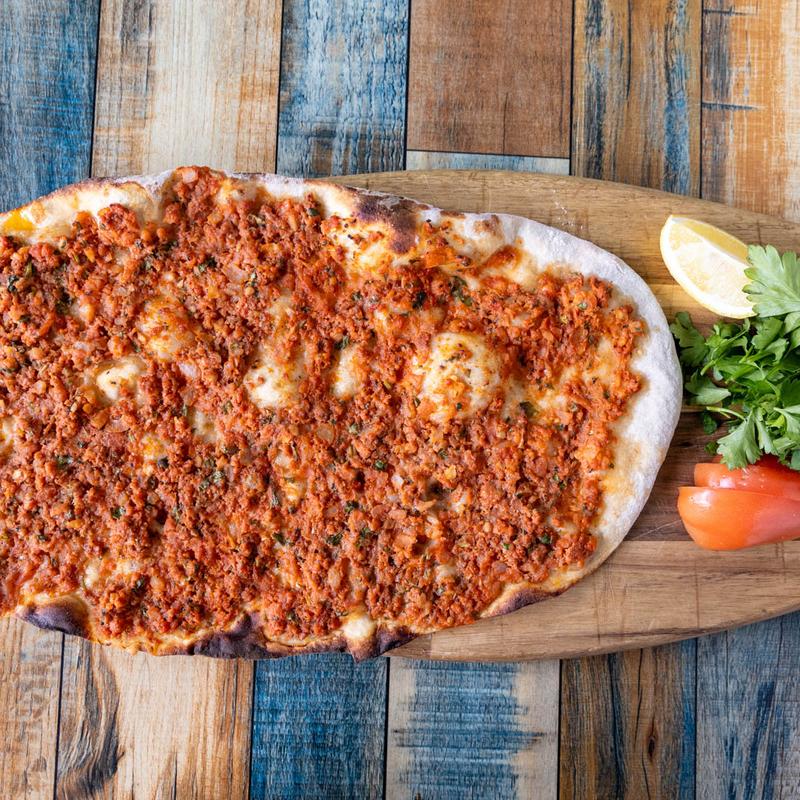 Flat, thin-layered Turkish bread topped with ground lamb, onions, parsley, and mozzarella cheese.