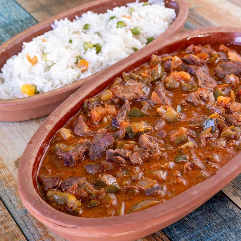 Cubes of lamb pan-seared with bell peppers, onions, tomatoes, and garlic flavored with seasonings. Served with rice.