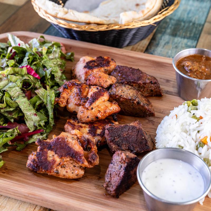 A combination of beef kebab, chicken kebab, grilled chicken, and lamb kofte served with rice and house salad, side bread good for two.